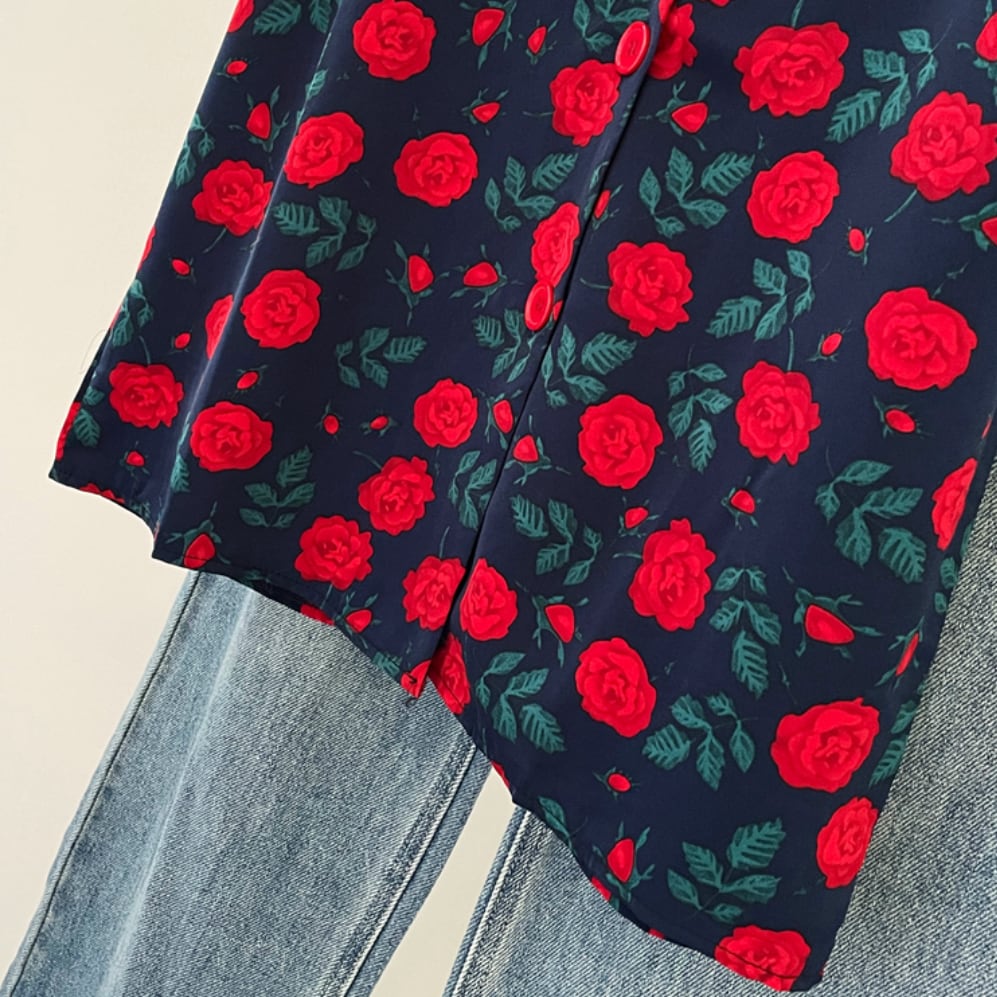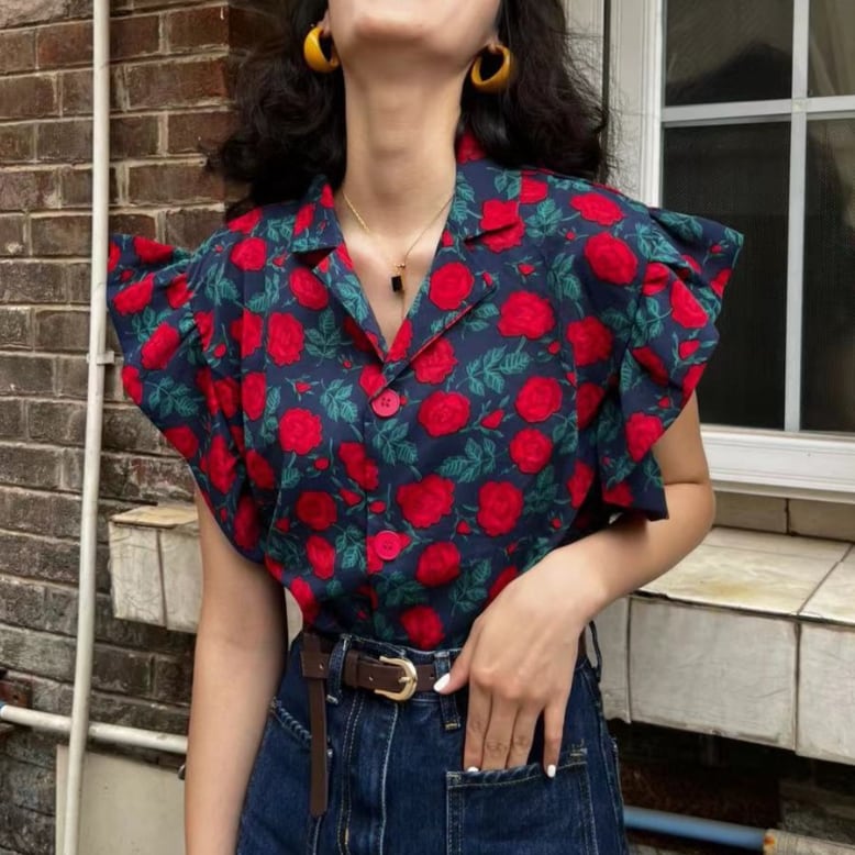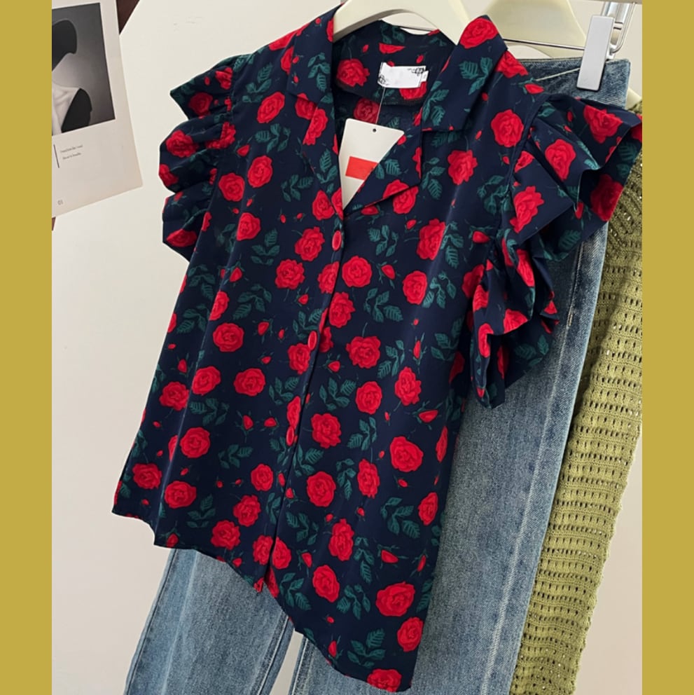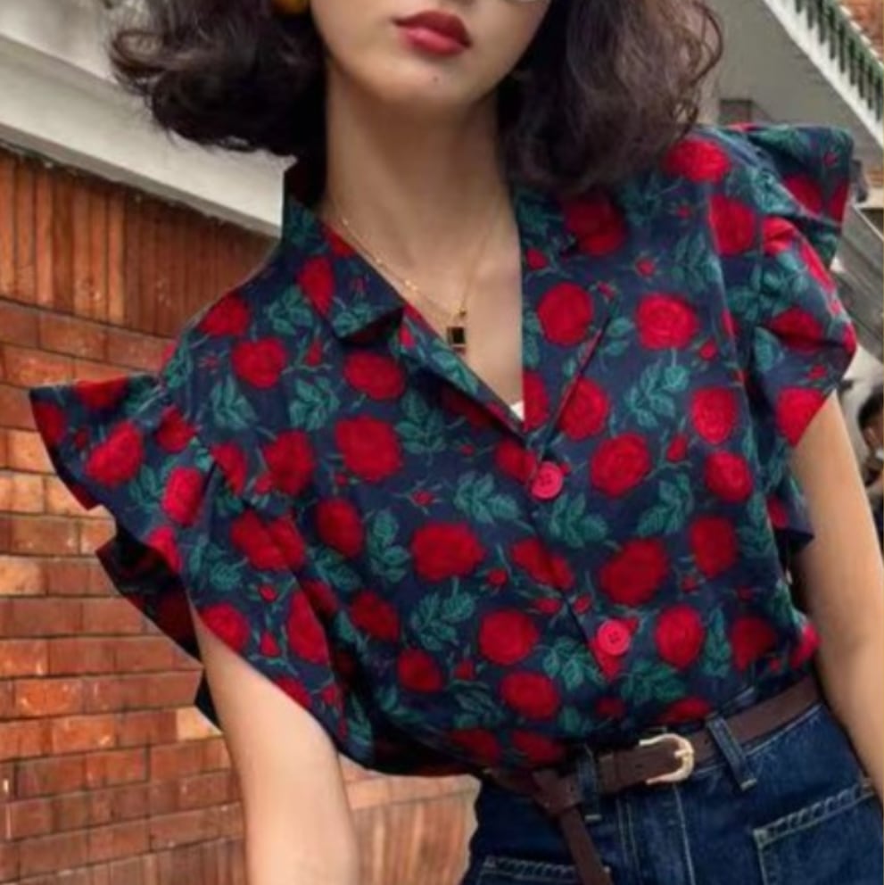 レトロローズプリントフリルスリーブトップス 25548
