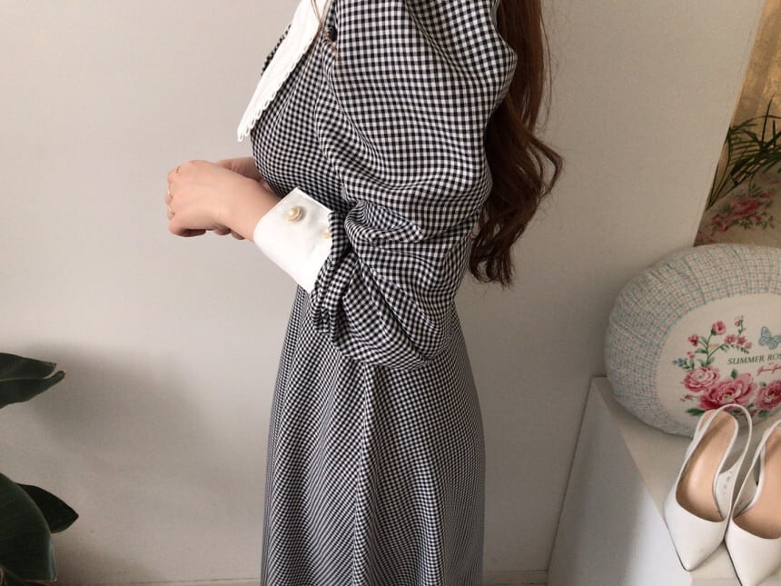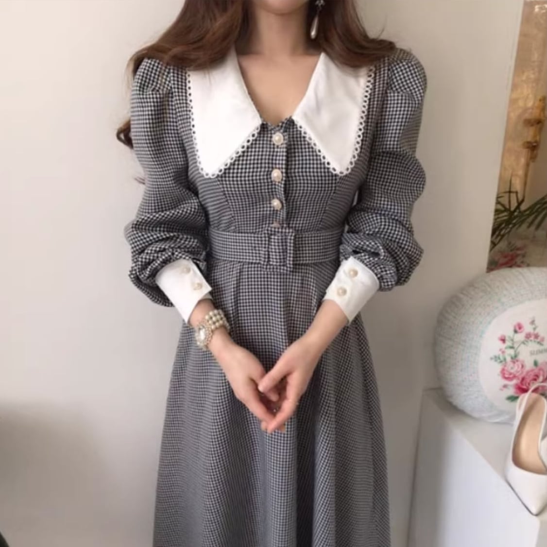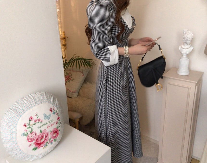 パフスリーブ、チェック柄、大きな襟、ベルト、パールボタン!!