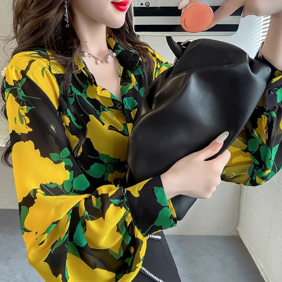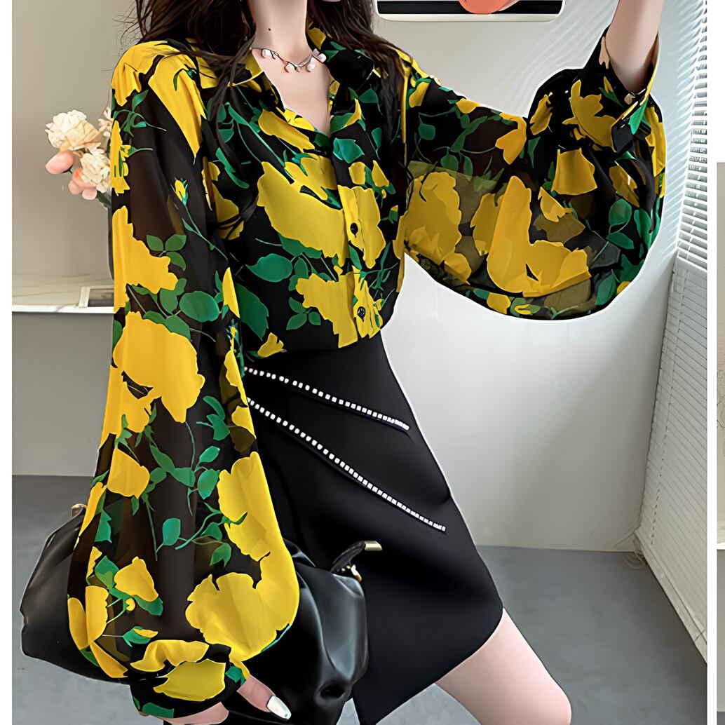 ランタンスリーブイエローフラワーシフォンシャツ 25202