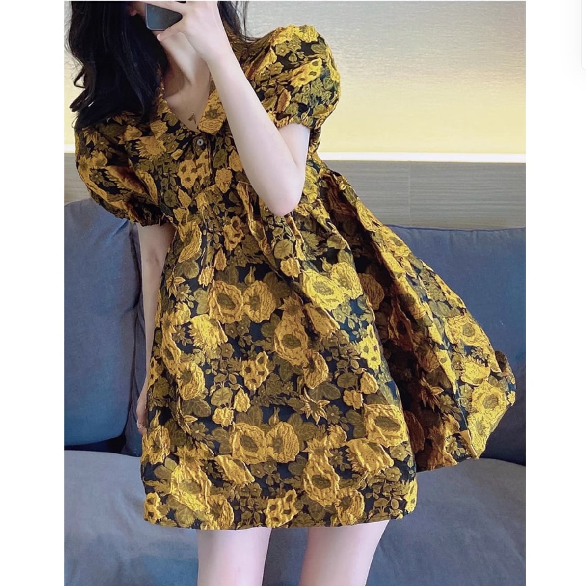 イエローフラワーパフスリーブジャガードワンピース 25345