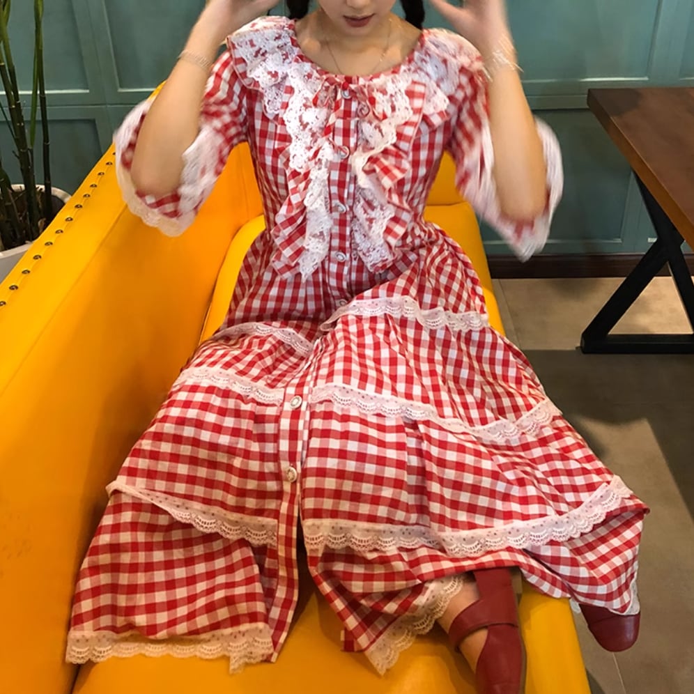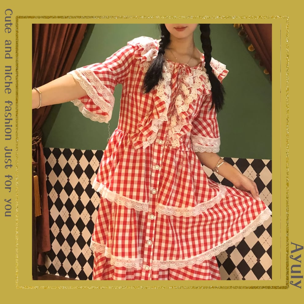 レトロチェックケーキスカートワンピース 25389